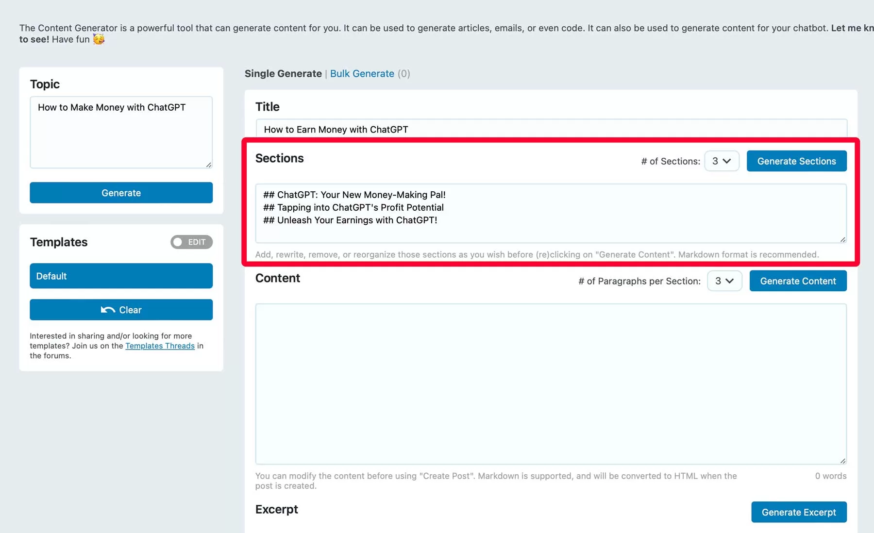 单击 “generate” 按钮后,AI Engine 将根据您输入的主题输入标题。下一步是创建章节。选择你想要的章节数量。在本教程中,我们将把版块数设置为 3。 然后点击生成版块按钮。ChatGPT 就会创建并将它们添加到页面中。