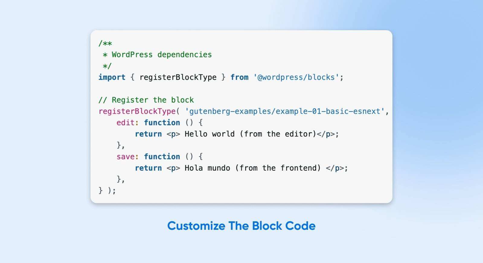 请注意,registerBlockType 函数被设置为同时处理功能块编辑器输入(”编辑”)和前端显示(”保存”)。