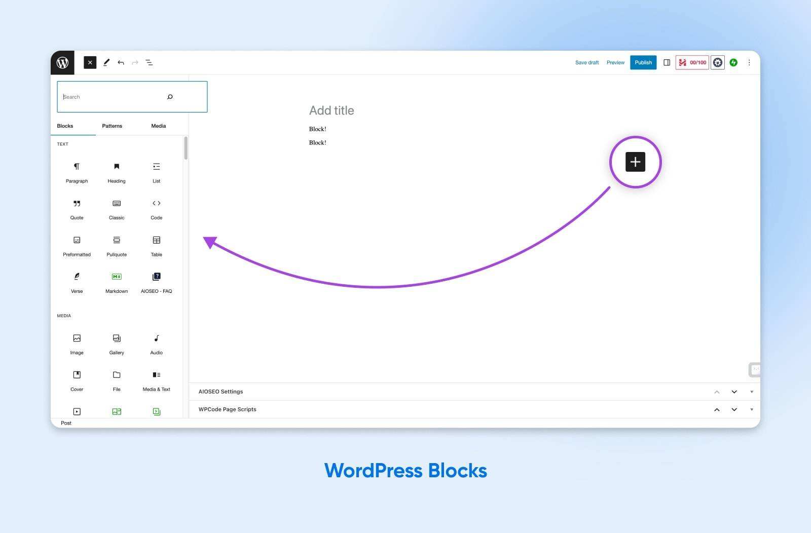 想想看,这有点像网站或页面生成器。您可以点击 “+” 按钮将区块添加到页面或帖子中,然后从各种区块选项中进行选择。当前版本的 WordPress 附带了 90 多个开箱即用的选项。