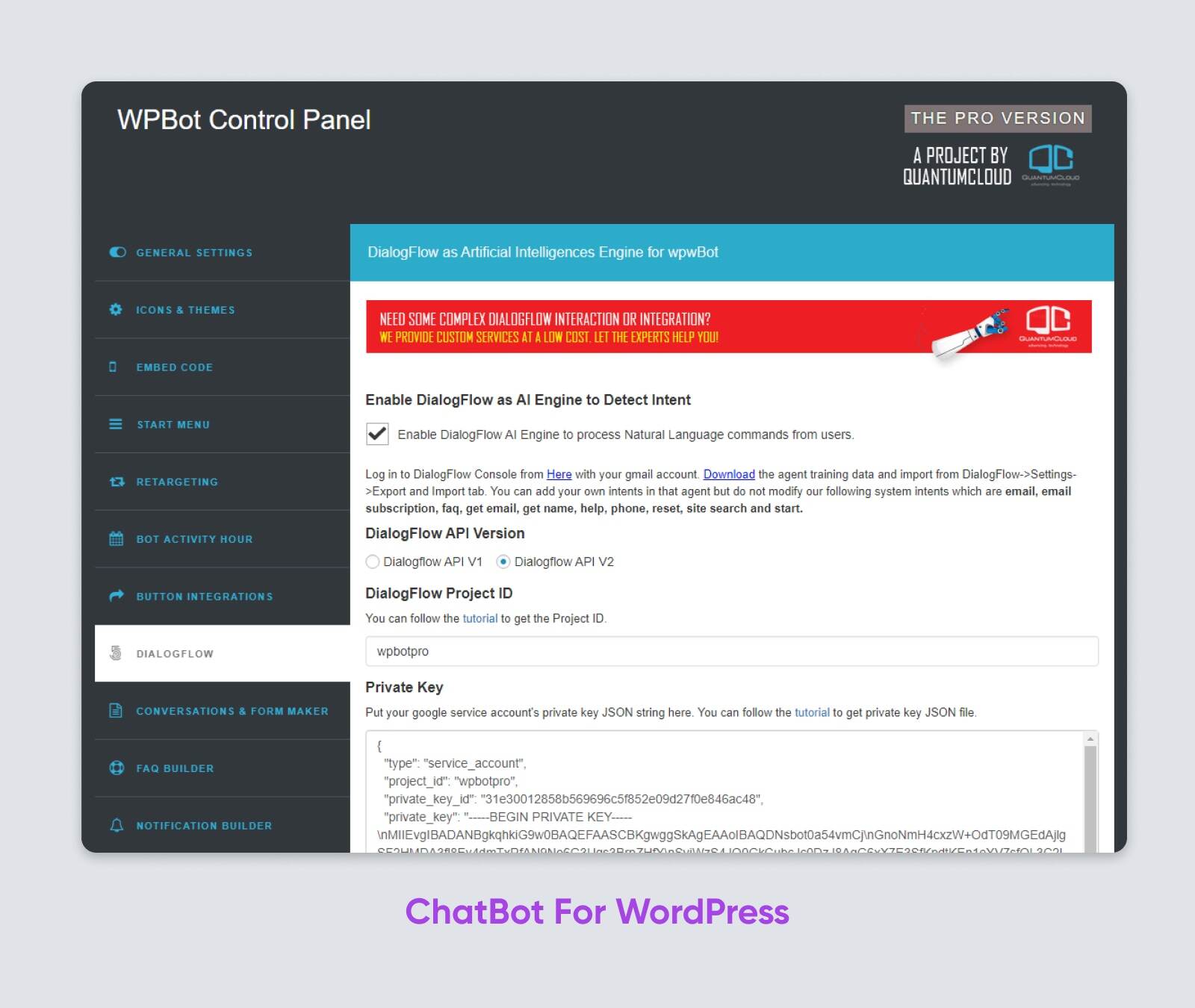 这是 WordPress 网站上功能最强大的即插即用聊天机器人之一。除了 ChatGPT,它还通过 Dialog Flow V2 与谷歌自然语言处理(NLP)和人工智能集成。你可以用它与网站上的用户互动,同时还可以将它连接到 Facebook Messenger、WhatsApp 和其他平台。