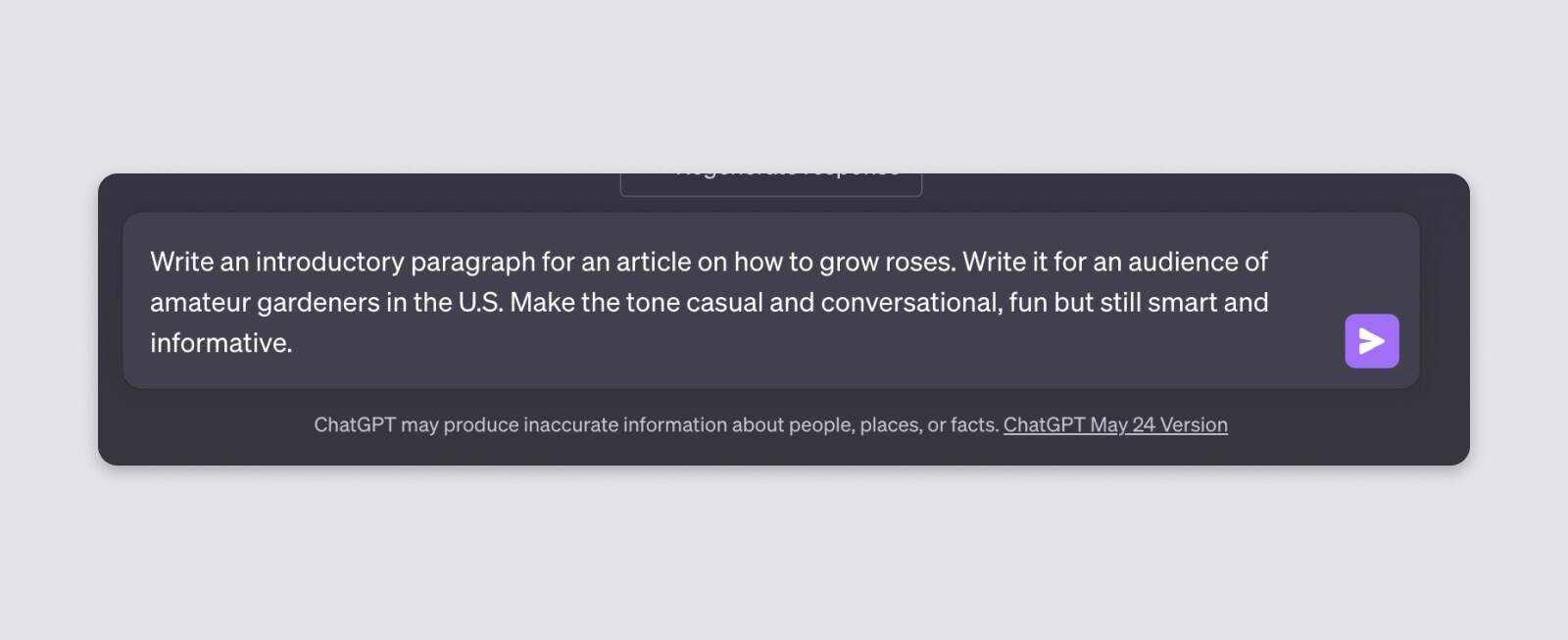 要使用这种方法,请访问 ChatGPT 并选择要使用的模式。然后,先让 ChatGPT 生成与网站主题或目的相关的内容大纲或简介。例如,如果你的网站是关于园艺的,而你想写关于 “如何种植玫瑰 “的内容,你可以这样提示 ChatGPT:”为一篇关于种植玫瑰的文章创建一个大纲 “或 “为一篇关于如何种植玫瑰的文章写一个介绍段落”。