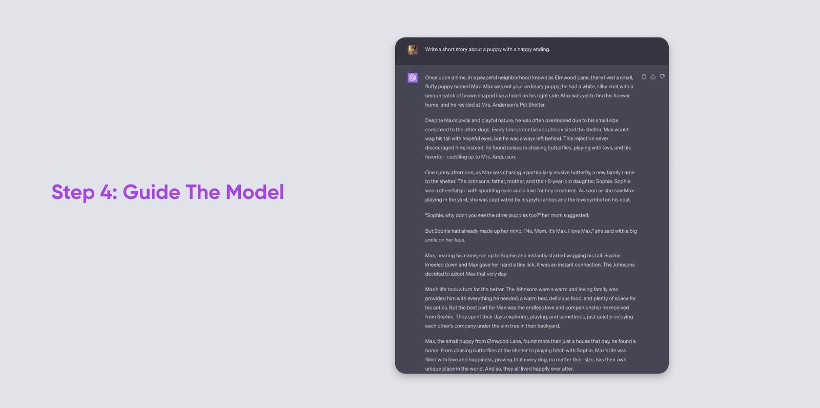 您不可能每次提问都能得到完全正确的输出结果–您的 ChatGPT 工作流程应该包括引导模型实现您想要的结果。换句话说,如果它没有给出您想要的答案,您可以尝试让您的指令更加明确。例如,如果您要求写一个短篇故事,并希望有一个快乐的结局,您可以说:”写一个关于小狗的短篇故事,并有一个快乐的结局”。你说得越清楚,就越有可能得到你想要的回复。