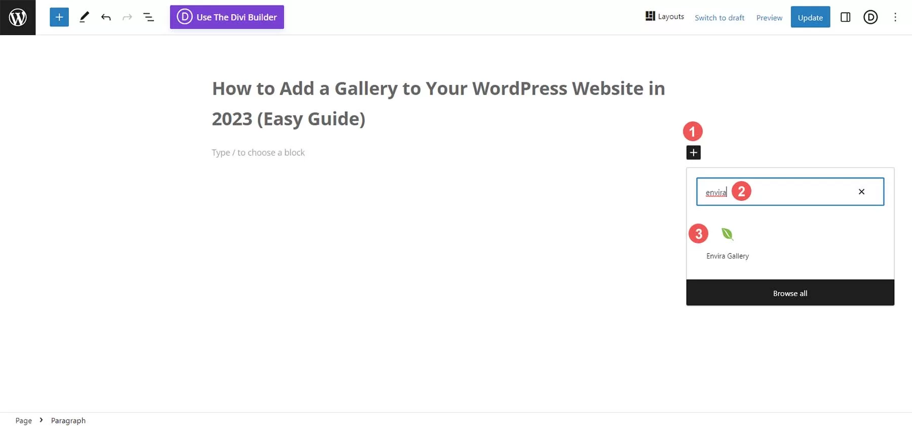 Eniva 相册自带一个区块,我们可以用它将相册添加到页面和文章中。为此,请单击黑色加号图标。这将弹出各种区块。在搜索栏中输入 Envira。这将弹出 Envira 相册区块。点击区块,将其添加到页面。