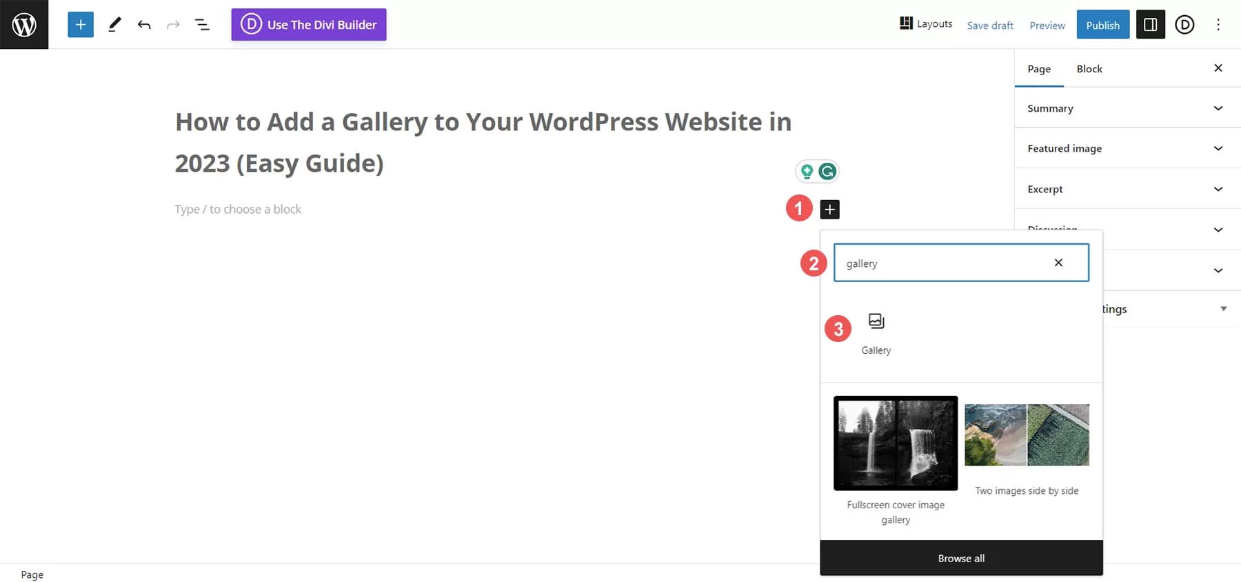 确定页面标题后,单击 “区块编辑器” 内容区域的黑色加号图标。这将打开可用区块。在搜索栏中输入 “画廊”。画廊区块就会出现。点击画廊区块,将该区块添加到页面中。
