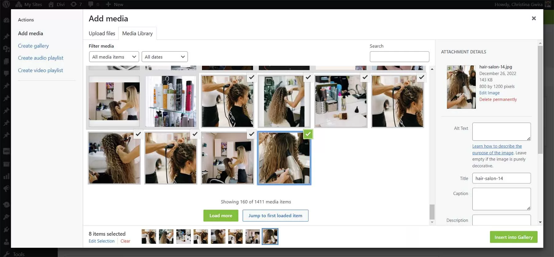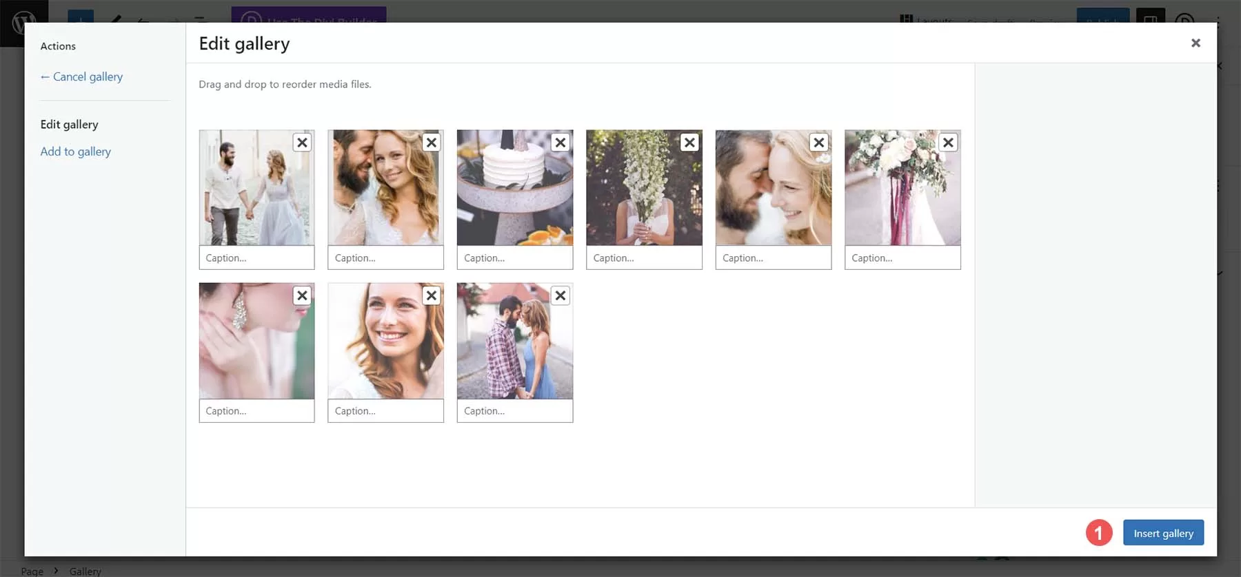 选择所选照片,然后点击蓝色的创建新相册按钮。现在,您可以添加标题或编辑相册中的每张照片。最后,单击蓝色的插入相册按钮,将相册添加到页面中。