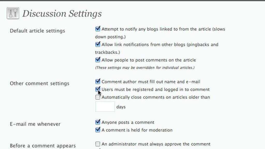 在 WordPress 的讨论设置中,评论出现前的选项为您提供了几种处理评论审核的方式:
