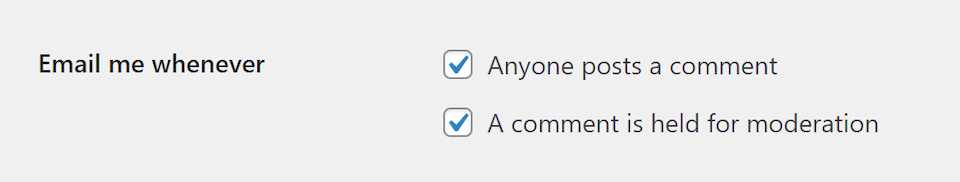 接下来,您可以确定 WordPress 如何在用户提交新评论时通知您。默认情况下,每当有人对您网站上的讨论发表意见时,您都会收到一封电子邮件: