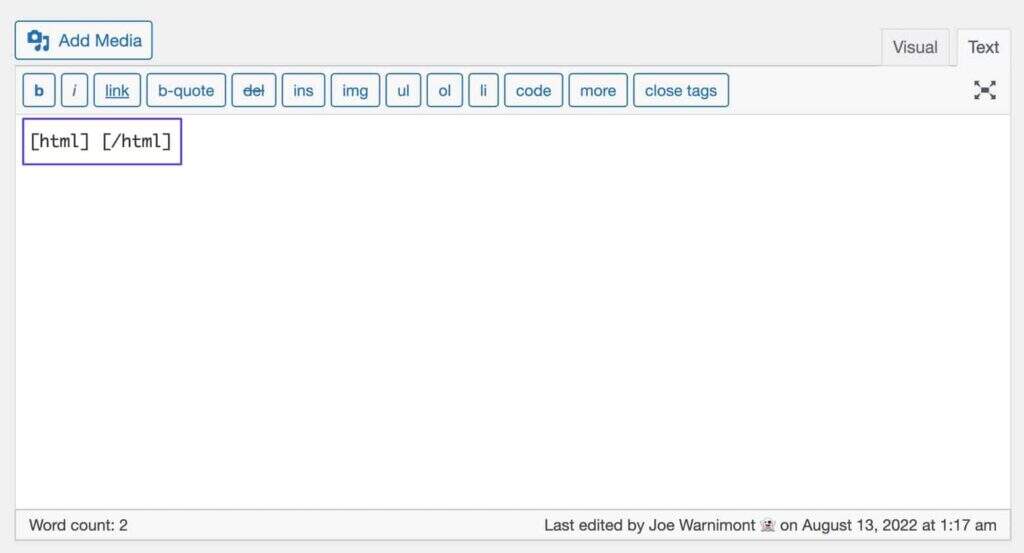 标记的过程与标记一样,但在插入代码时,您有更多的空间可以使用。转到一篇文章,打开代码(古腾堡)或文本(经典WordPress)编辑器。粘贴或键入要显示的代码。然后,用以下标签包围代码: