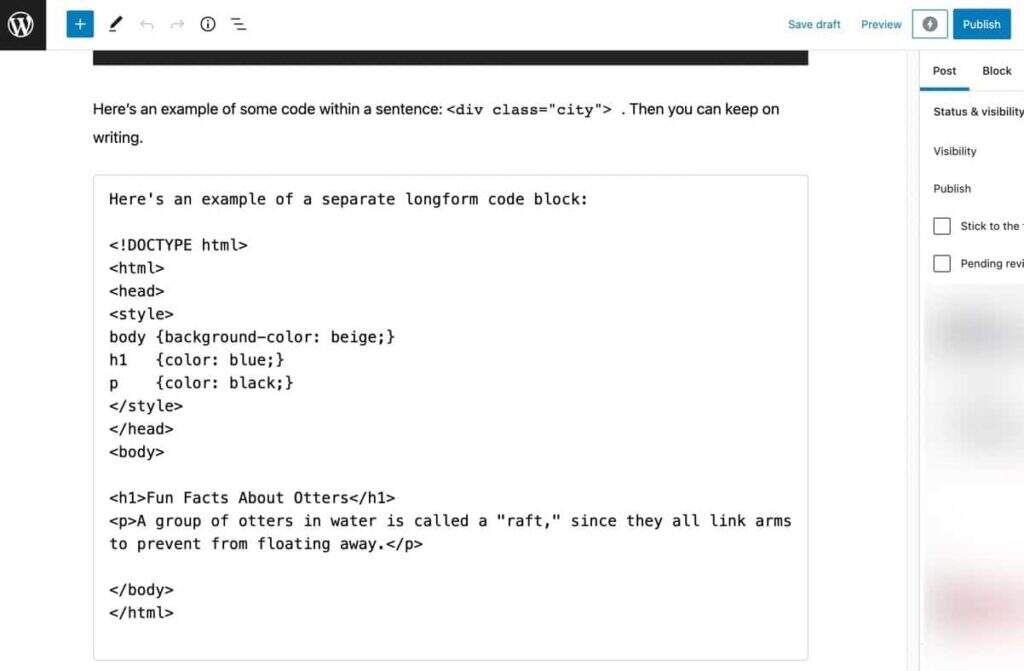 WordPress Gutenberg编辑器已经有了一个内置的代码区块,它允许您显示代码片段,而不会丢失任何格式或实际激活代码。