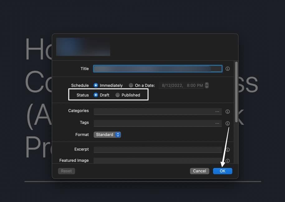 然而,最重要的部分是将状态设置为草稿,以便在没有先在WordPress上审查的情况下,不发布该文章。