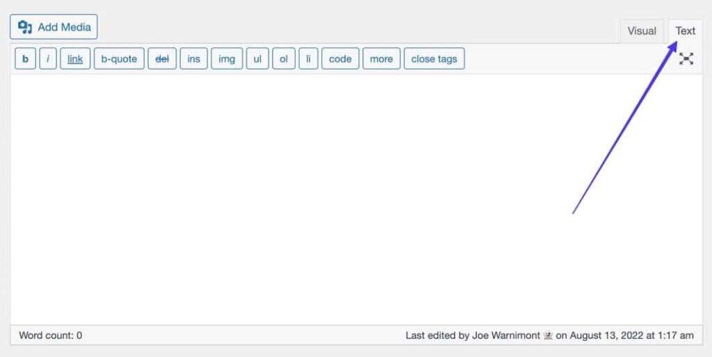 切换到视觉编辑器(无论您是在古腾堡还是经典WordPress)。