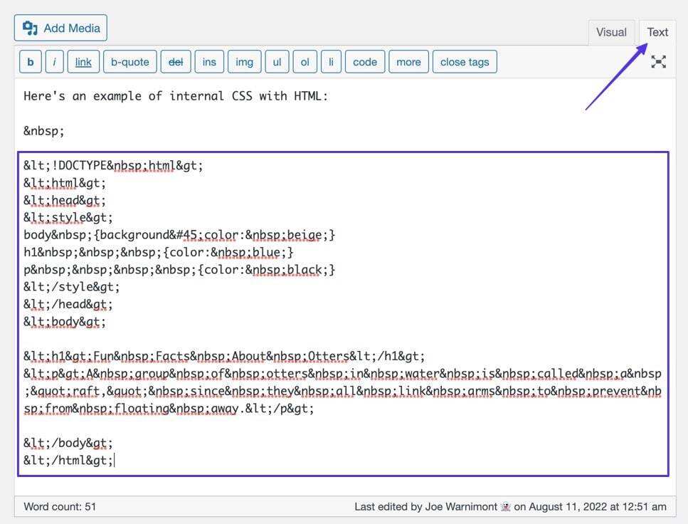 要做到这一点,请打开一篇WordPress文章,然后打开代码编辑器(用于古腾堡区块编辑器)或文本编辑器(当使用WordPress经典时)。