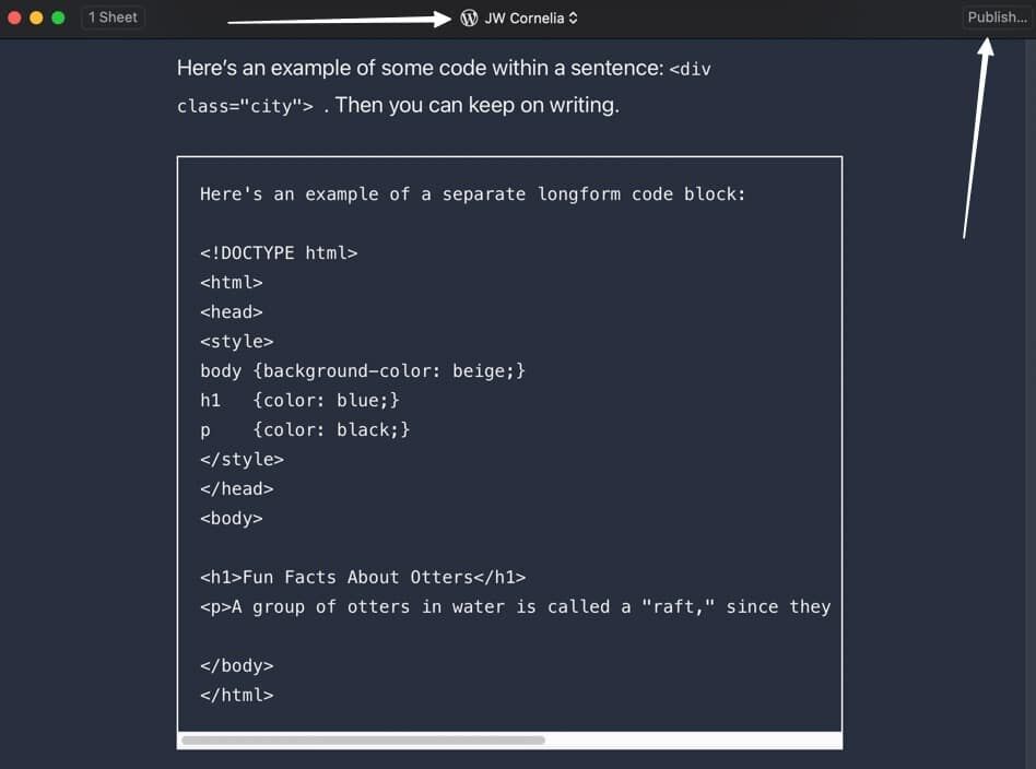 与WordPress连接的markdown编辑器的奇妙之处在于,它们在整个传输过程中保持着代码区块。所以,你会看到格式很好的代码高亮显示,准备在WordPress中发布。