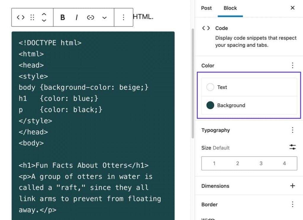 您可以根据需要设置“代码”区块的样式,并可以选择更改文本和背景色等内容。