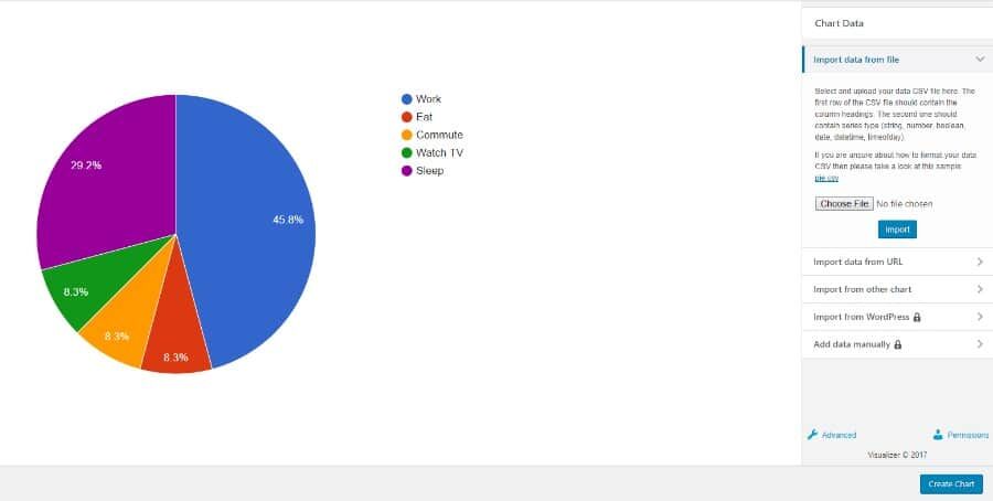 它包括九种图表类型、简码支持以及使用CSV导入大量数据的选项。这个图表插件也被称为Visualizer插件,所以你可能会看到它被称为那个。有免费版和专业版。专业版至少需要74美元(一个站点许可证),它提供了从其他图表导入的工具。其他一些专业功能包括: