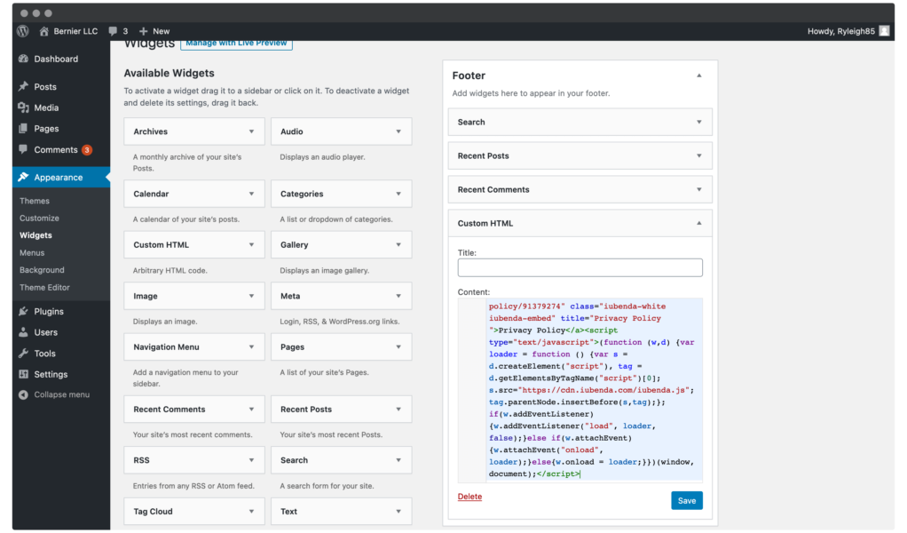 在这里,将代码复制到剪贴板,然后返回WordPress。为简单起见,请转到Appearance > Widgets,选择Custom HTML小工具,粘贴您的代码,然后保存您的更改: