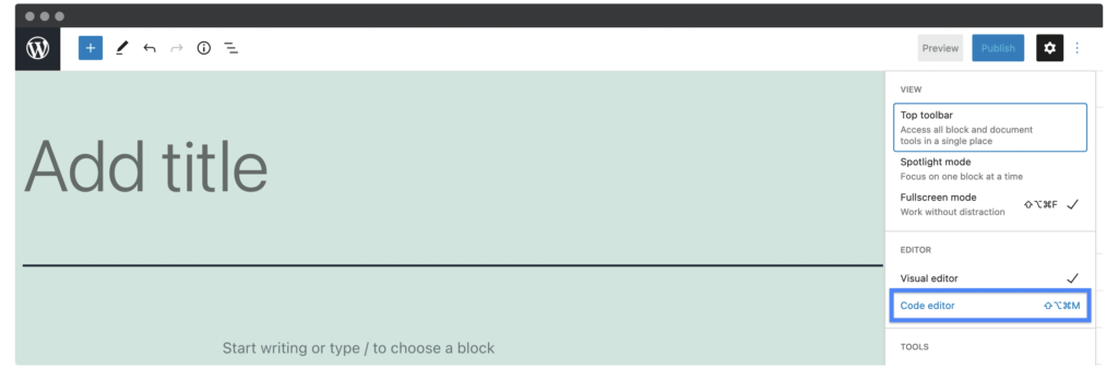 首先,在WordPress中单击页面 > 添加新的。在新草稿中,前往屏幕右侧的选项菜单,然后单击代码编辑器: