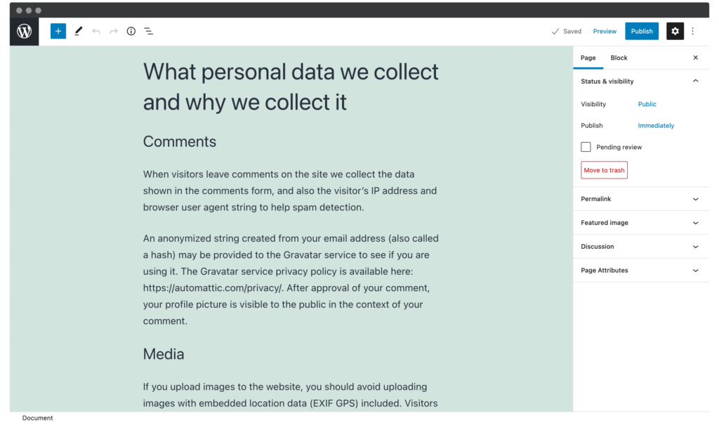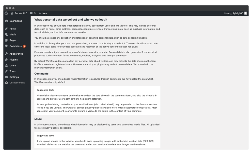 最新版本的WordPress包括一个内置的隐私页面。这是一个部分完整的模板,可通过WordPress仪表盘访问。