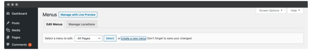 为此,请前往WordPress中的外观 > 菜单。在这里,要么选择现有的页脚菜单,要么单击创建新菜单链接: