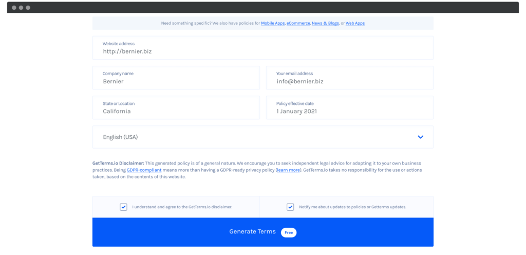 填写详细信息后,单击Generate Terms,网站将创建隐私政策和服务条款: