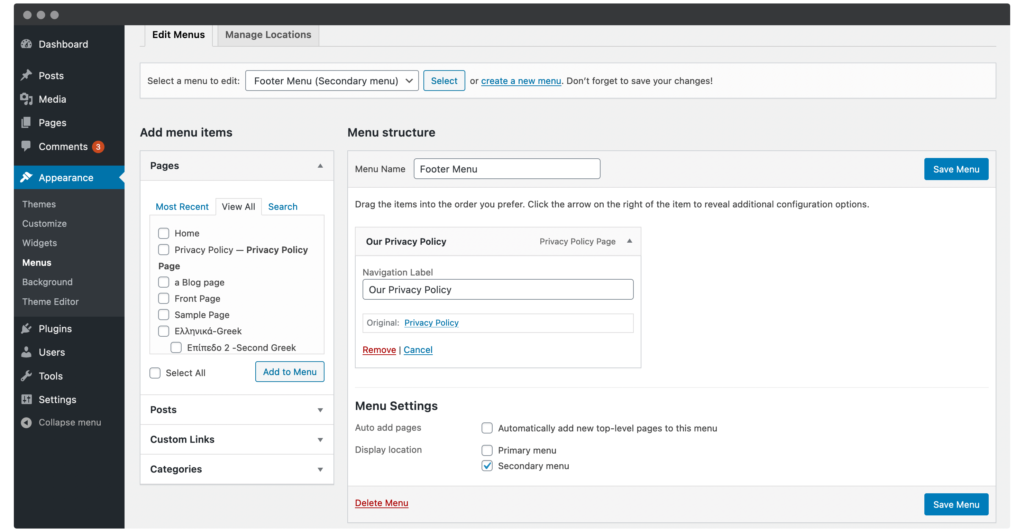 最后一步是展开菜单项并在必要时更改导航标签,然后单击Save Menu:
