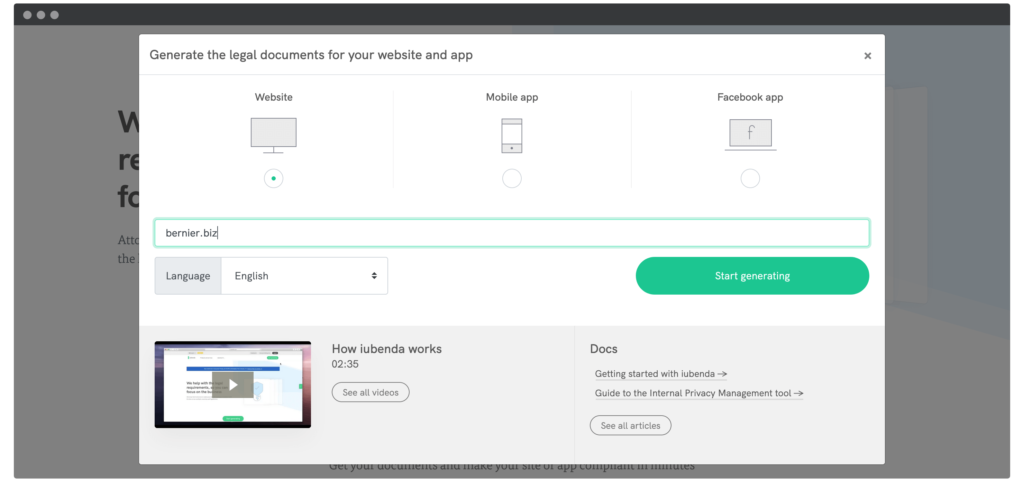 首先,前往iubenda网站并单击开始生成。系统会要求您选择隐私政策的重点和公司名称。如果您需要帮助,这里还有一个视频: