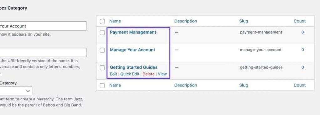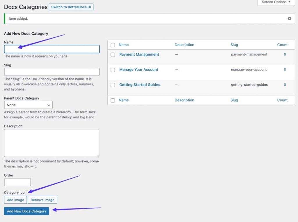 WordPress百科和知识库在将文档组织成类别的过程中蓬勃发展。因此,BetterDocs建议创建一些类别和文档来启动该过程。
