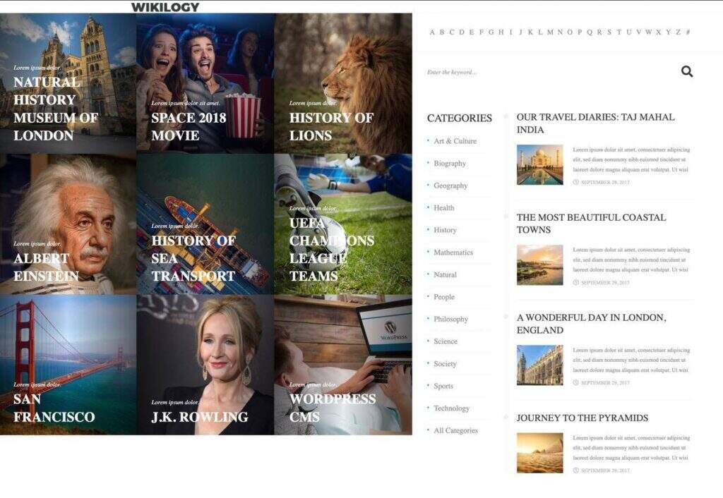 百科在主页上展示文章,字母菜单位于顶部。还有一个搜索栏,就像您在传统的WordPress百科中看到的一样。