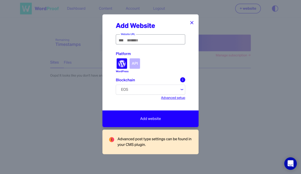您需要添加您的URL,选择WordPress作为您的平台,并选择EOS作为您的区块链: