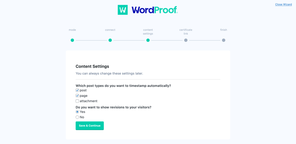 您可以单击“Validate”以进入“Content Settings”步骤。这使您可以选择默认设置时间戳的内容类型,以及是否向访问者显示修订历史记录: