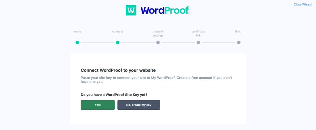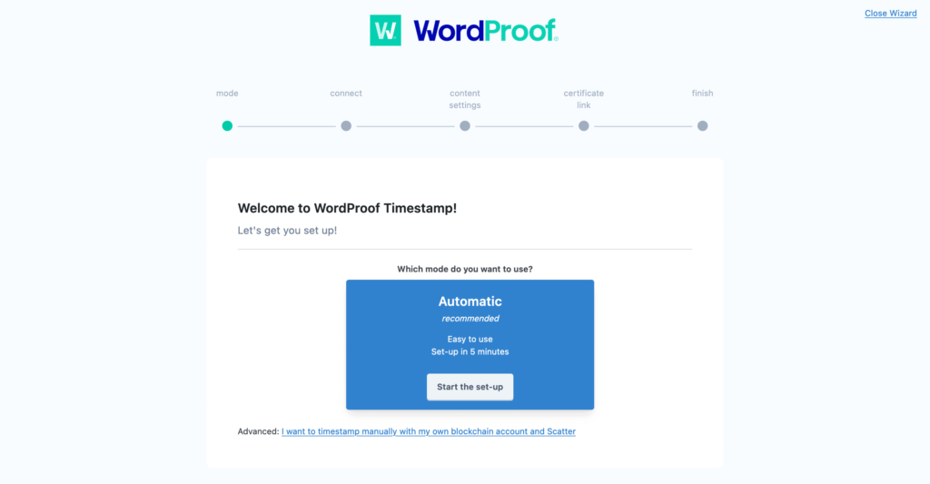 就像许多其他插件一样,这将帮助您准备好使用WordProof。单击“Launch Setup Wizard”按钮后,您将进入五个屏幕中的第一个。
