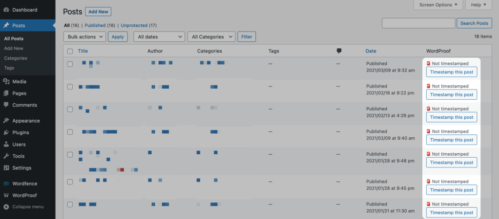 这为每个文章或页面提供了一个按钮来为您的内容添加时间戳。这样做会“调用”WordProof的服务器,从而启动时间戳: