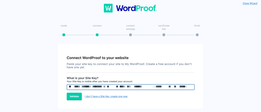 在大多数情况下,你还不会。为此,请单击No, create my key按钮,这将带您进入WordProof仪表盘。在这里,使用专用选项添加网站: