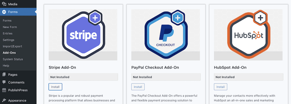 对于付款方式,这也很简单。但是,如果您还没有任何激活的网关,请前往Forms > Add-Ons屏幕,然后安装适合您需要的网关:
