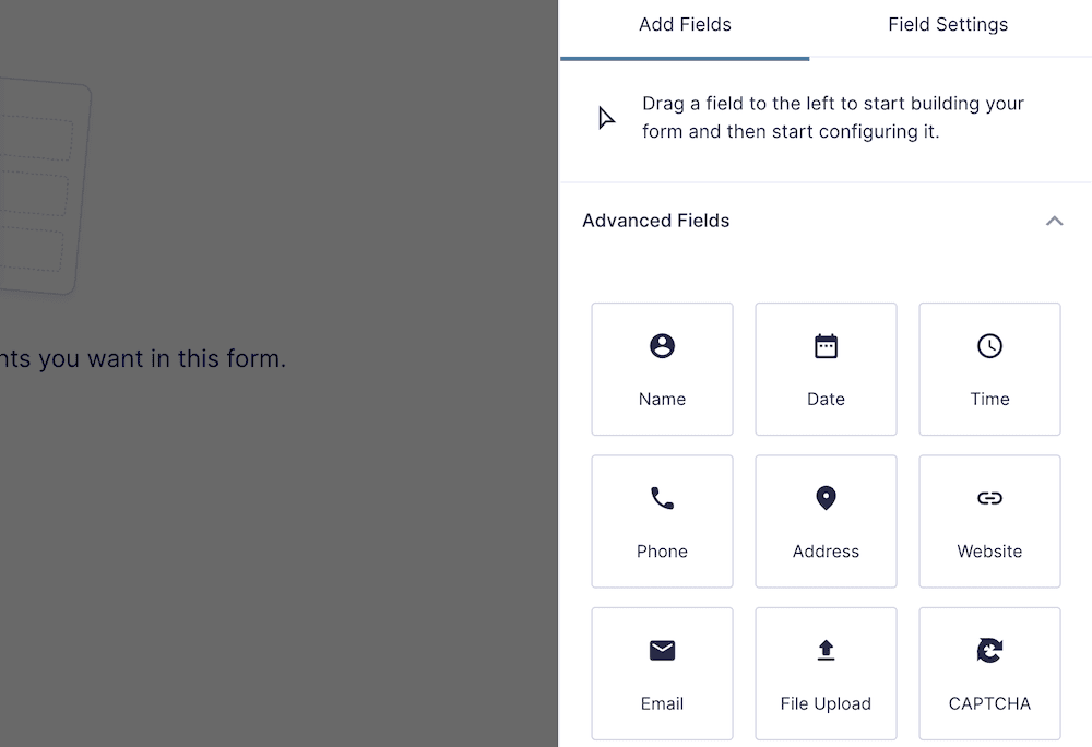 在开始使用捐赠功能之前,您需要花一些时间来构建表单的总体布局,并添加一些必要的字段。对于初学者,您需要询问姓名和电子邮件地址。您可以从右侧边栏中执行此操作。高级字段部分提供任务的特定字段: