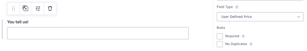 当然,这不会让用户输入自定义图形(还)。为此,您需要在表单中添加另一个产品字段。这次,从下拉选项中选择User Defined Price,并将其命名为与您的自定义单选按钮相同的名称: