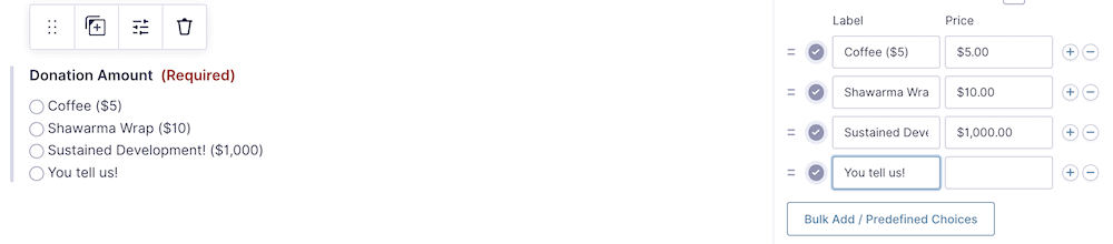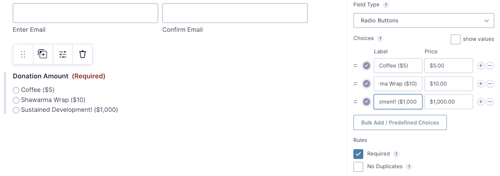 最好将这些字段设置为Required,并添加一个电子邮件确认字段。但是,您只想添加处理捐赠所需的字段。我们建议询问姓名、电子邮件地址和捐款金额。对于后者,您可以查看多种不同的方法。