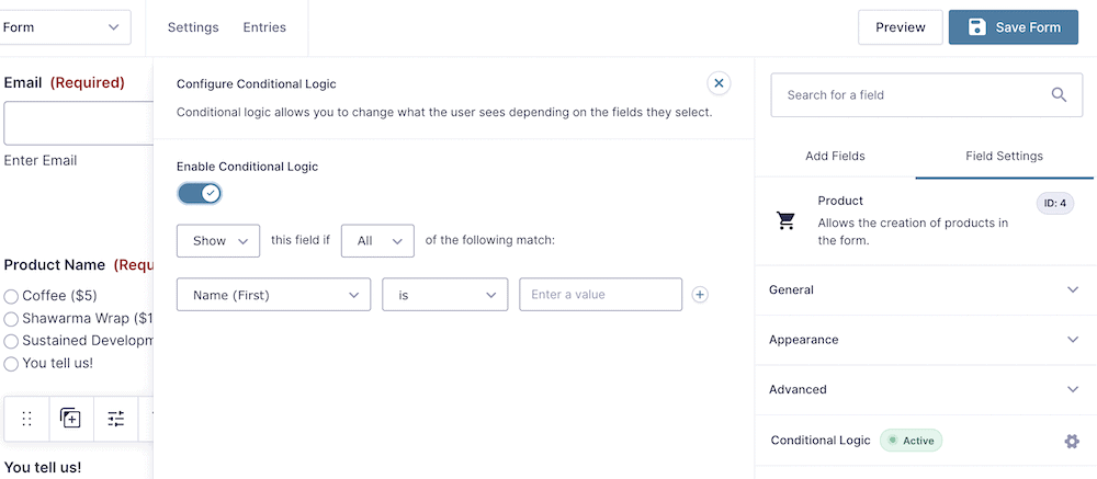 要为该字段提供功能,您需要启用条件逻辑。这将帮助您在表单上提供独特的选项,我们将在接下来讨论这一点。