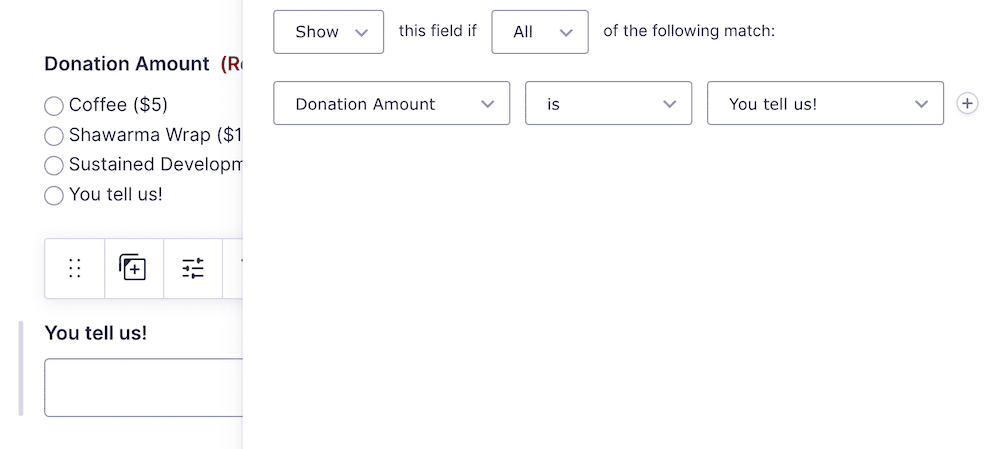 简而言之,当Donation Amount部分下的单选按钮与用户定义的定价选项相关时,您需要确保条件逻辑使自定义定价字段可见: