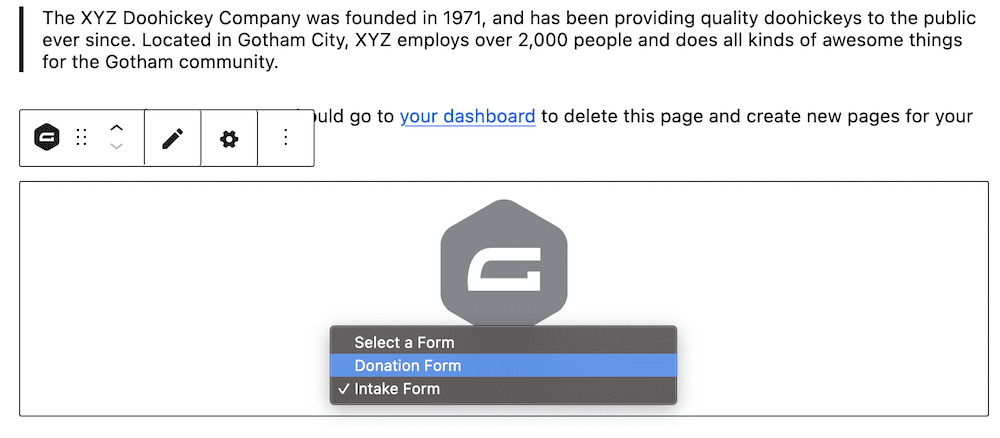 嵌入过程与任何其他WordPress元素一样简单。当我们使用块编辑器时,您可以使用Elementor、Beaver Builder或其他页面构建器。但是,过程将类似:选择Gravity Forms选项,并将其放在页面上。从那里,从下拉菜单中选择正确的表格: