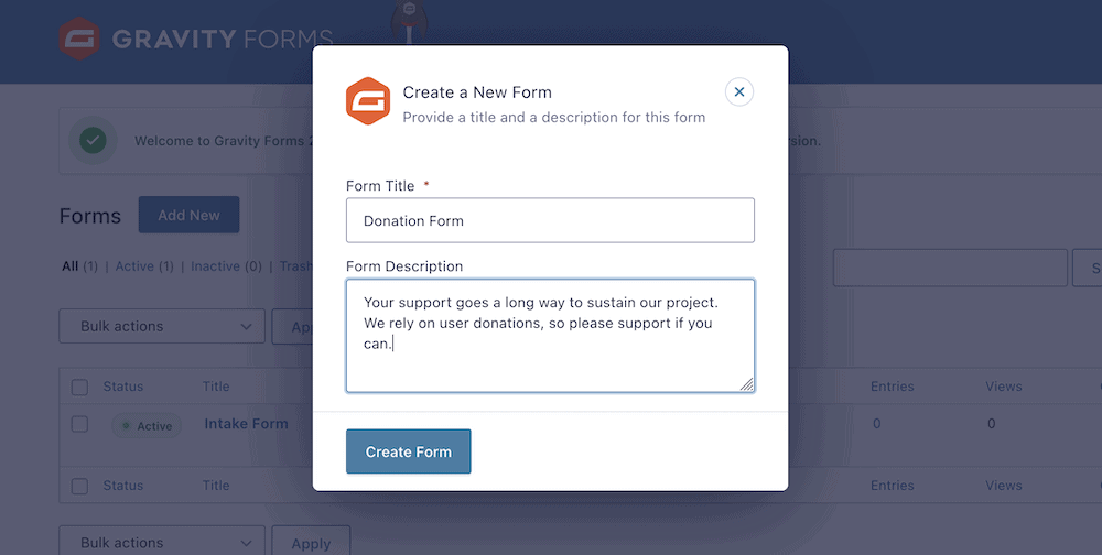 安装并激活Gravity Forms后,您可以前往Forms > New Form屏幕。这将显示一个用于创建新表单的弹出对话框。在这里,输入必填标题和可选描述,然后单击Create Form:
