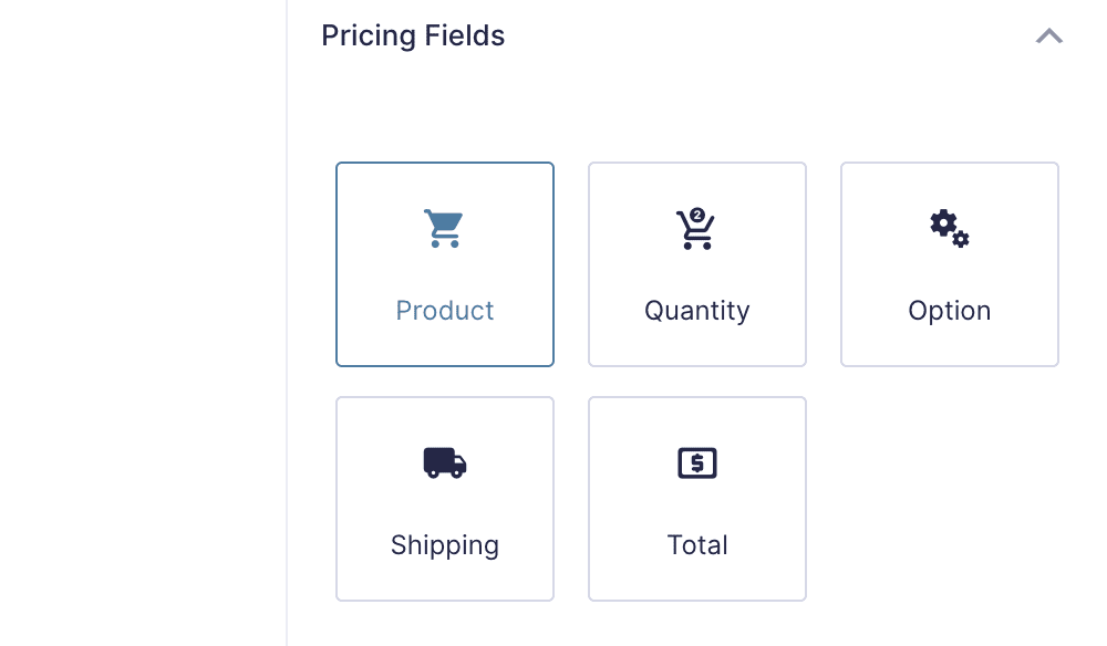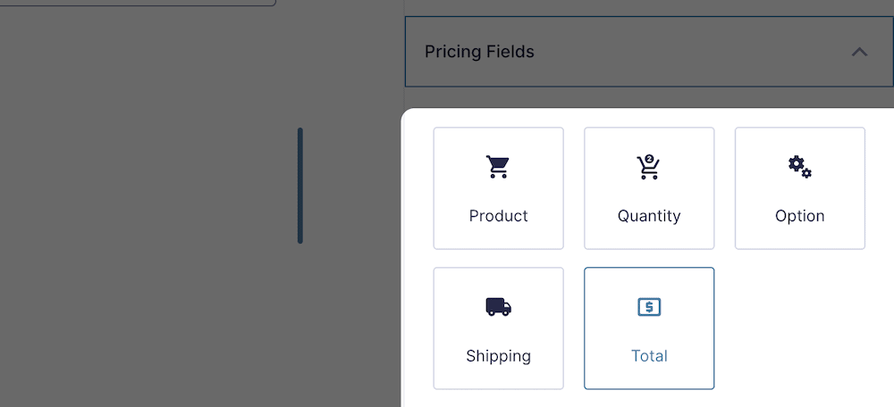 我们必须包括两个元素:用户查看总金额的方式和支付方式。第一个很简单;选择Pricing Fields > Total选项: