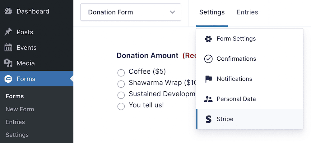 从这里,您需要将卡字段连接到网关。为此,您可以从表单构建器屏幕顶部的“Settings”下拉菜单中选择它:
