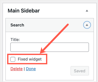 现在,转到“外观 > 小工具”部分,您可以在每个小工具下方看到一个额外的复选框选项。如果您使用的是经典小工具区域,您可以为要显示为粘性浮动的项目启用“固定小工具”复选框。