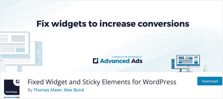 这是WordPress博主最常用的选项,因为它非常容易实现。早些时候,它被称为Q2W3 Fixed Widget,随后被Advanced Ads接管并在插件存储库中积极维护。转到WordPress管理面板中的“插件 > 安装插件”部分,然后搜索“fixed widget”。您可以找到“Fixed Widgets and Sticky Elements for WordPress”插件并将其安装在您的网站上。