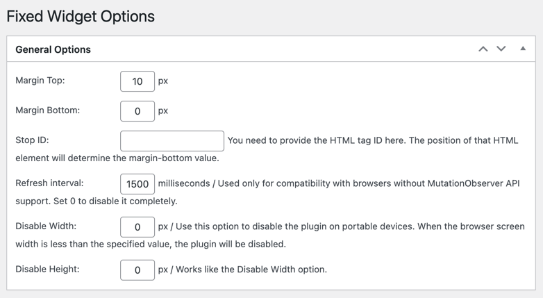激活插件后,转到“外观 > Fixed Widget Options”部分。在这里,您可以通过提供Stop ID来调整插件的设置,例如边距以及要在哪里停止浮动。通常,您不需要在此处进行任何更改,并保持设置不变。如果您发现小工具在滚动时碰到屏幕的顶部或底部,则增加边距顶部/底部大小以提供足够的间隙。