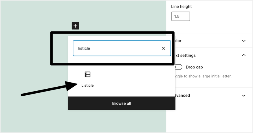- 在区块插入器中输入单词“listicle”,如下所示,然后选择“Listicle”区块。