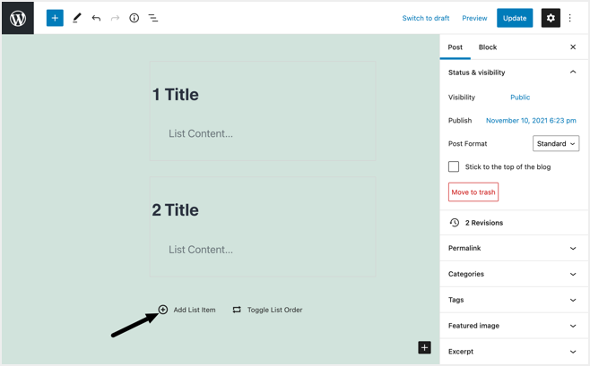 - 然后,您将看到一个listicle区块自动生成,您将能够向其中添加内容。默认情况下,该插件将为您提供2个列表项,但您可以通过单击“Add List Items”按钮不断添加更多。