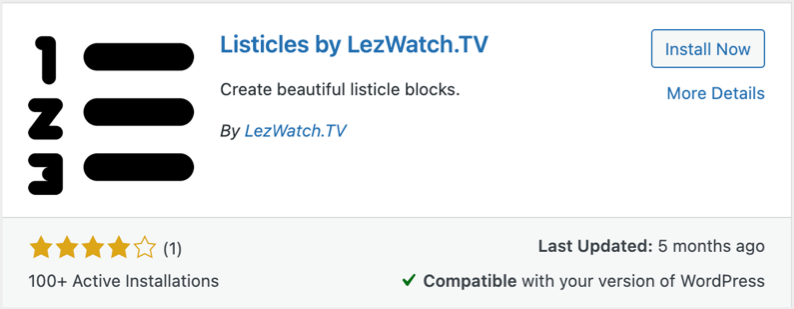 - 在您的站点中安装并激活Listicles by LezWatch.TV插件。