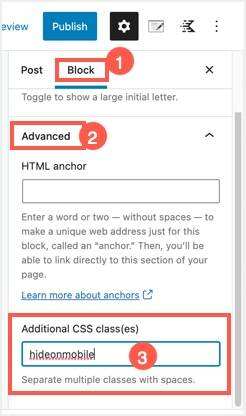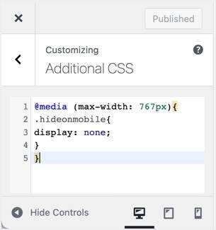现在,该区块将隐藏在宽度小于767像素的任何设备上。同样,您也可以通过在小工具区块编辑器中添加自定义CSS来隐藏小工具。您可以利用对多个区块和小工具使用相同的CSS类(在我们的示例中为hideonmobile)来使用相同的CSS在移动设备上隐藏所有它们。
